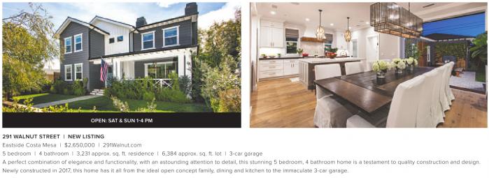 OPEN: SAT &SUN 1-4 PM 291 WALNUT STREET | NEW LISTING Eastside Costa Mesa | $2,650,000 | 291Walnut.com 5 bedroom | 4 bathroom | 3,231 approx. sq. ft. residence | 6,384 approx. sq. ft. lot | 3-car garage A perfect combination of elegance and functionality, with an astounding attention to detail, this stunning 5 bedroom, 4 bathroom home is a testament to quality construction and design. Newly constructed in 2017, this home has it all from the ideal open concept family, dining and kitchen to the immaculate 3-car garage. See also