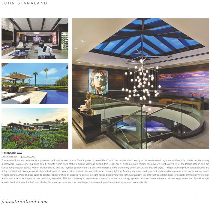 11 MONTAGE WAY Laguna Beach | $29,000,000 The level of luxury is undeniably impressive,the location world-class. Standing atop a coastal bluff amid the resplendent beauty of the sun-soaked Laguna coastline, this private contemporary masterwork is a rare offering. With only 13 private home sites at the fabulous Montage Resort, this 9,500 sq. ft. custom estate commands coveted front row views of the Pacific Ocean and the surrounding natural beauty. Master craftsmanship and the highest quality materials are a consistent theme, delivering both comfort and opulent style. The generously proportioned spaces are richly detailed with Wenge wood, illuminated slabs of onyx, custom mosaic tile, natural stone, custom lighting, floating staircase, and gourmet kitchen with stainless steel accentuating exotic wood cabinetry.Walls of glass open to outdoor spaces while an expansive central skylight floods both levels with light. Extravagant lower level has full bar, glass-encased commercial wine cellar and outdoor lanai with spectacular one-story waterfall. Effortless livability is enjoyed with state-of-the-art technology systems. Owners have access to all Montage amenities: Spa Montage, Mosaic Pool, dining at the Loft and Studio. Personal services such as concierge, housekeeping and engineering support are available.