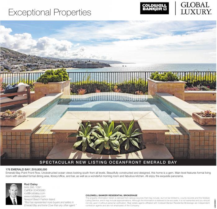 Exceptional Properties SPECTACULAR NEW LISTING OCEANFRONT EMERALD BAY 176 EMERALD BAY | $19,800,000 Emerald Bay Point Front Row. Unobstructed ocean views looking south from all levels. Beautifully constructed and designed, this home is a gem. Main level features formal living room with elevated formal dining area, library/office, and bar, as well as a wonderful morning room and fabulous kitchen. All enjoy the exquisite panorama. Rod Daley 949.395.1091 CalRE# 00456990 rod@roddaley.com www.roddaley.com Newport Beach Fashion Island “Rod has represented more buyers and sellers in Emerald Bay and Irvine Cove than any other agent.” COLDWELL BANKER RESIDENTIAL BROKERAGE The property information herein is derived from various sources that may include, but not be limited to, county records and the Multiple Listing Service, and it may include approximations. Although the information is believed to be accurate, itisnot warranted and you should not rely upon it without personal verification. Real estate agents affiliated with Coldwell Banker Residential Brokerage are independent contractor agents and are not employees of the Company. See also