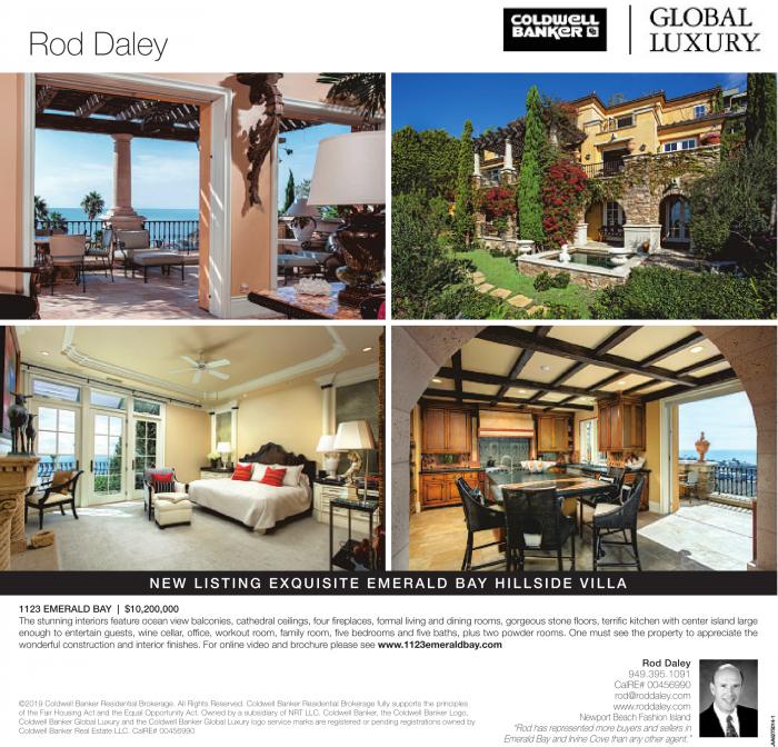 Rod Daley NEW LISTING EXQUISITE EMERALD BAY HILLSIDE VILLA 1123 EMERALD BAY | $10,200,000 The stunning interiors feature ocean view balconies, cathedral ceilings, four fireplaces, formal living and dining rooms, gorgeous stone floors, terrific kitchen with center island large enough to entertain guests, wine cellar, office, workout room, family room, five bedrooms and five baths, plus two powder rooms. One must see the property to appreciate the wonderful construction and interior finishes. For online video and brochure please see www.1123emeraldbay.com ©2019 Coldwell Banker Residential Brokerage. All Rights Reserved. Coldwell Banker Residential Brokerage fully supports the principles of the Fair Housing Act and the Equal Opportunity Act. Owned by a subsidiary of NRT LLC. Coldwell Banker, the Coldwell Banker Logo, Coldwell Banker Global Luxury and the Coldwell Banker Global Luxury logo service marks are registered or pending registrations owned by Coldwell Banker Real Estate LLC. CalRE# 00456990 Rod Daley 949.395.1091 CalRE# 00456990 rod@roddaley.com www.roddaley.com Newport Beach Fashion Island “Rod has represented more buyers and sellers in Emerald Bay and Irvine Cove than any other agent.” See also