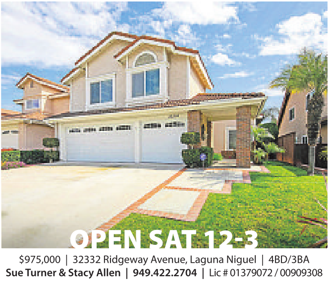 $975,000 | 32332 RidgewayAvenue,Laguna Niguel | 4BD/3BA Sue Turner &StacyAllen | 949.422.2704 | Lic #01379072/00909308
