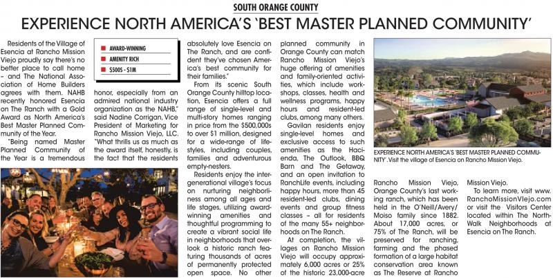 Residents of the Village of Esencia at Rancho Mission Viejo proudly say there’s no better place to call home – and The National Association of Home Builders agrees with them. NAHB recently honored Esencia on The Ranch with a Gold Award as North America’s Best Master Planned Community of the Year.
