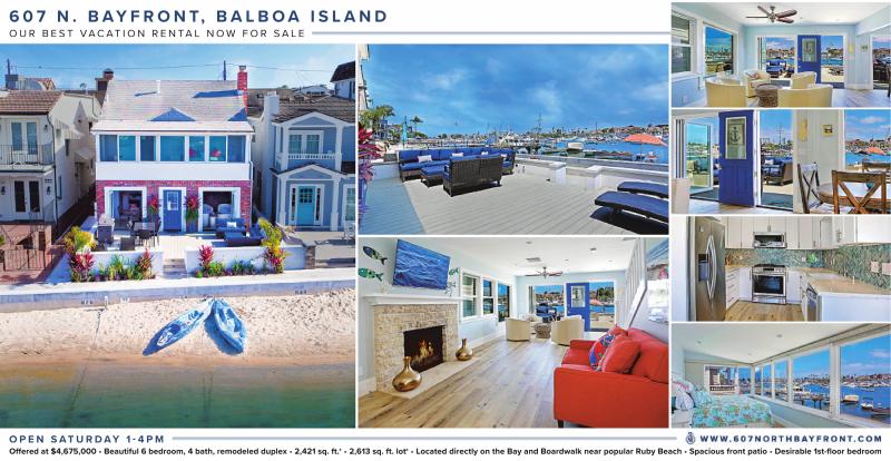 6 0 7 N . B A Y F R O N T , B A L B O A I S L A N D O U R B E S T V A C AT I O N R E N TA L N O W F O R S A L E O P E N S AT U R D AY 1 - 4 P M Offered at $4,675,000 • Beautiful 6 bedroom, 4 bath, remodeled duplex • 2,421 sq. ft.* • 2,613 sq. ft. lot* • Located directly on the Bay and Boardwalk near popular Ruby Beach • Spacious front patio • Desirable 1st-floor bedroom