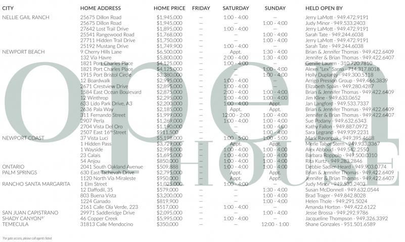 CITY HOME ADDRESS HOME PRICE FRIDAY SATURDAY SUNDAY HELD OPEN BY NELLIE GAIL RANCH t h COAST 1 Hidden Pass $3,729,000 — Appt. Appt. Merle Tabor Stern · 949.933.3367 ONTARIO PALM SPRINGS RANCHO SANTA MARGARITA SAN CAPISTRANO SHADY CANYON ®* TEMECULA * Forgateaccess, please call agents listed See also
