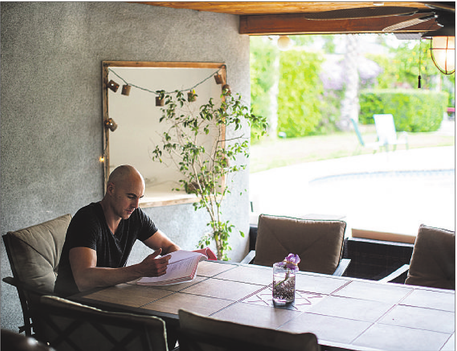 He moved into the 3,600- square-foot home a year and a half ago. It features a roofed, insulated patio, where Tait reads scripts, and a swimming pool that he and his family enjoy during the summer.