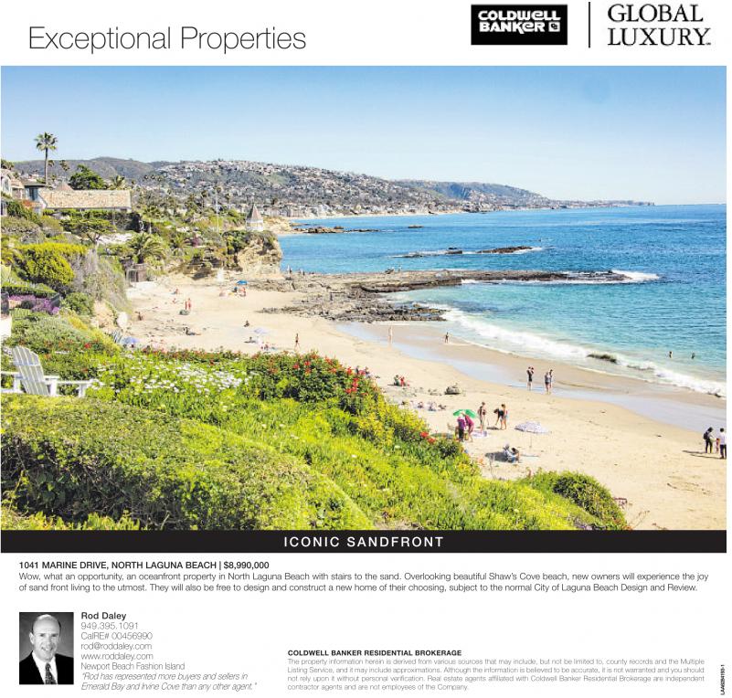 1041 MARINE DRIVE, NORTH LAGUNA BEACH | $8,990,000 Wow, what an opportunity, an oceanfront property in North Laguna Beach with stairs to the sand. Overlooking beautiful Shaw’s Cove beach, new owners will experience the joy of sand front living to the utmost. They will also be free to design and construct a new home of their choosing, subject to the normal City of Laguna Beach Design and Review.