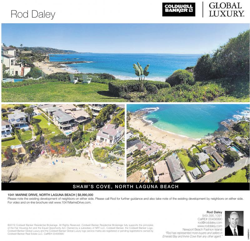 Rod Daley SHAW’S COVE, NORTH LAGUNA BEACH 1041 MARINE DRIVE, NORTH LAGUNA BEACH | $8,990,000 Please note the existing development of neighbors on either side. Please call Rod for further guidance and also take note of the existing development by neighbors on either side. For video and on-line brochure visit www.1041MarineDrive.com. ©2019 Coldwell Banker Residential Brokerage. All Rights Reserved. Coldwell Banker Residential Brokerage fully supports the principles of the Fair Housing Act and the Equal Opportunity Act. Owned by a subsidiary of NRT LLC. Coldwell Banker, the Coldwell Banker Logo, Coldwell Banker Global Luxury and the Coldwell Banker Global Luxury logo service marks are registered or pending registrations owned by Coldwell Banker Real Estate LLC. CalRE# 00456990 Rod Daley 949.395.1091 CalRE# 00456990 rod@roddaley.com www.roddaley.com Newport Beach Fashion Island “Rod has represented more buyers and sellers in Emerald Bay and Irvine Cove than any other agent.”