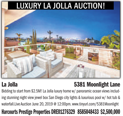 Bidding to start from $2.5M! La Jolla luxury home w/ panoramic ocean views includingstunning night view jewel boxSan Diego citylights&luxurious pool w/ hottub & waterfall.Live AuctionJune20, 2019 @12:00pm. www.tinyurl.com/5381Moonlight
