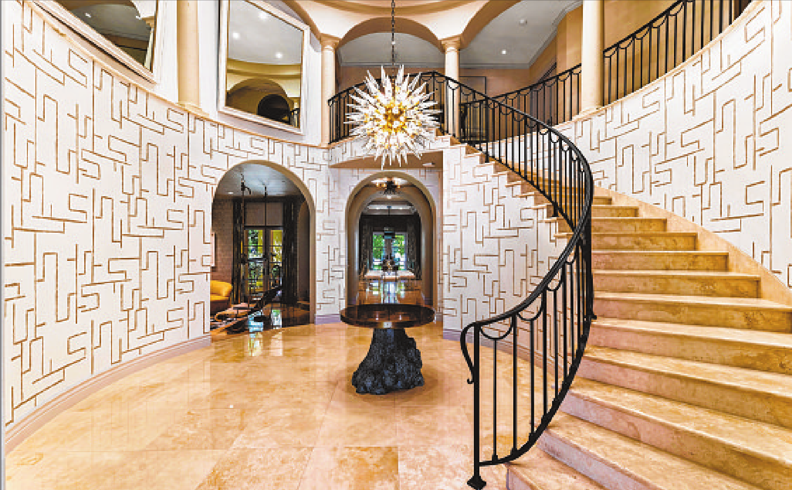 Six bedrooms, eight bathrooms, a movie theater and office round out the two-story floor plan. Upstairs, a master suite with mirrored walls expands to a lounge and wraparound balcony.