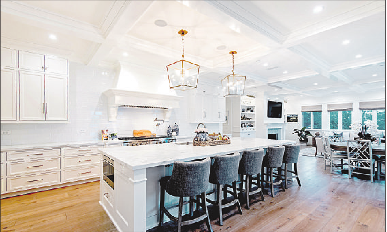 bathrooms. Coffered ceilings top the chef’s kitchen and breakfast area,