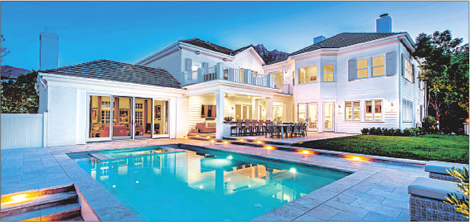 Aloggia lines the home’s back side, opening up to a covered arbor, outdoor kitchen, swimming pool and spa. The landscaped grounds cover three-quarters of an acre.