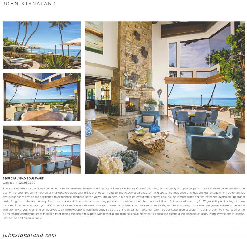 J O H N S T A N A L A N D 5305 CARLSBAD BOULEVARD Carlsbad | $29,950,000 The stunning allure of the ocean combined with the aesthetic beauty of this estate will redefine Luxury Oceanfront living. Undoubtedly a trophy property this Californian paradise offers the best of the best. Set on 1.5 meticulously landscaped acres with 166 feet of ocean frontage and 10,000 square feet of living space the residence provides endless entertainment opportunities and public spaces which are positioned to experience headland ocean views. The generous 5 bedroom layout offers convenient double master suites and the detached oversized 1 bedroom casita for guests is better than any 5 star resort. A world class entertainment wing provides an elaborate exercise room and director’s theater with seating for 12 graced by an inviting sit down bar area. Rule the world from your 600 square foot surf break office with sweeping views to La Jolla along the sandstone bluffs, and featuring electronics that cast you anywhere in the world with the rock of your chair and connect you to all the news/sports instantaneously by a state of the art 72 inch flatscreen with 4 screen separation capacity. The unprecedented integration of the elements provided by nature with ocean front setting melded with superb workmanship and materials have elevated this exquisite estate to the pinnacle of luxury living. Private beach access. Best house on California coast. johnstanaland .com