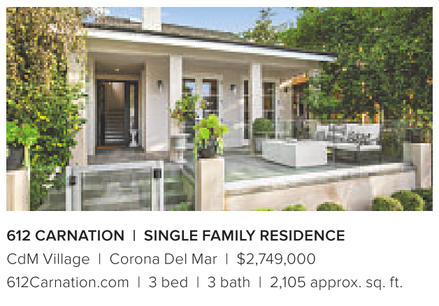 612 CARNATION | SINGLE FAMILY RESIDENCE CdM Village | Corona Del Mar | $2,749,000 612Carnation.com | 3 bed | 3 bath | 2,105 approx. sq. ft.