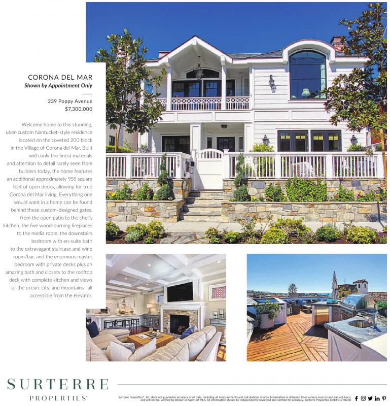 Welcome home to this stunning, uber-custom Nantucket-style residence located on the coveted 200 block in the Village of Corona del Mar. Built builders today, the home features Corona del Mar living. Everything one would want in a home can be found behind these custom-designed gates, to the media room, the downstairs bedroom with en-suite bath room/bar, and the enormous master of the ocean, city, and mountains—all accessible from the elevator.