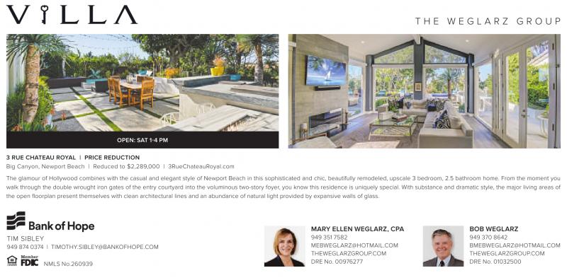 T H E W E G L A R Z G R O U P OPEN: SAT 1-4 PM 3 RUE CHATEAU ROYAL | PRICE REDUCTION Big Canyon, Newport Beach | Reduced to $2,289,000 | 3RueChateauRoyal.com The glamour of Hollywood combines with the casual and elegant style of Newport Beach in this sophisticated and chic, beautifully remodeled, upscale 3 bedroom, 2.5 bathroom home. From the moment you walk through the double wrought iron gates of the entry courtyard into the voluminous two-story foyer, you know this residence is uniquely special. With substance and dramatic style, the major living areas of the open floorplan present themselves with clean architectural lines and an abundance of natural light provided by expansive walls of glass. TIM SIBLEY 949 874 0374 | TIMOTHY.SIBLEY@BANKOFHOPE.COM NMLS No.260939 MARY ELLEN WEGLARZ, CPA 949 351 7582 MEBWEGLARZ@HOTMAIL.COM THEWEGLARZGROUP.COM DRE No. 00976277 BOB WEGLARZ 949 370 8642 BMEBWEGLARZ@HOTMAIL.COM THEWEGLARZGROUP.COM DRE No. 01032500