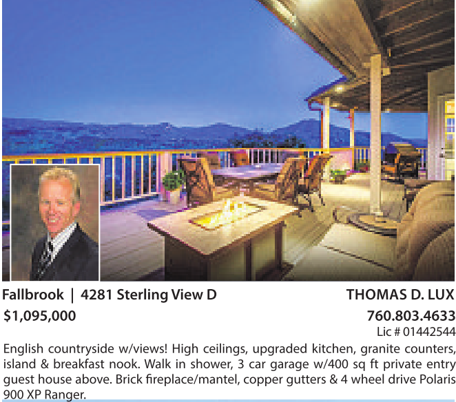 Fallbrook | 4281 Sterling View D THOMAS D. LUX $1,095,000 760.803.4633 Lic #01442544
