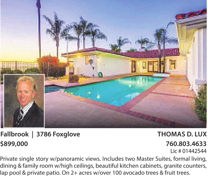 Fallbrook | 3786 Foxglove THOMAS D. LUX $899,000 760.803.4633 Lic #01442544