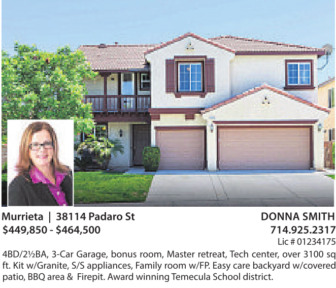 Murrieta | 38114 PadaroSt DONNA SMITH $449,850 -$464,500 714.925.2317 Lic #01234175