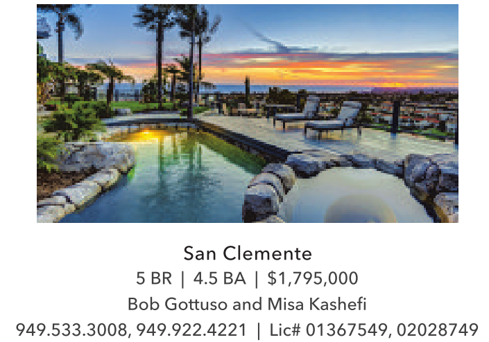 San Clemente 5 BR | 4.5 BA | $1,795,000 Bob Gottuso and Misa Kashefi 949.533.3008, 949.922.4221 | Lic# 01367549, 02028749