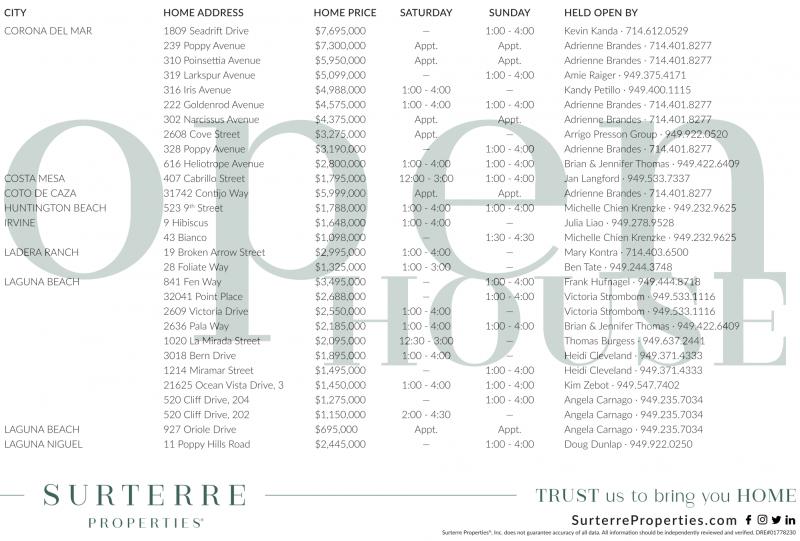 CITY HOME ADDRESS HOME PRICE SATURDAY SUNDAY HELD OPEN BY CORONA DEL MAR COSTA MESA COTO DE CAZA HUNTINGTON 523 9 IRVINE LADERA RANCH LAGUNA LAGUNA LAGUNA NIGUEL SurterreProperties.com