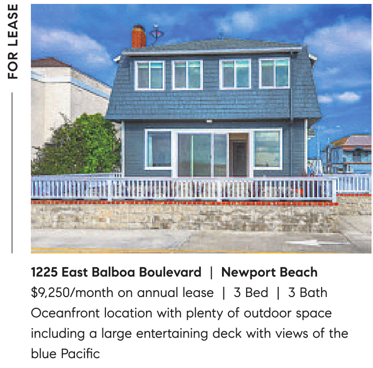 1225 East Balboa Boulevard | Newport Beach $9,250/month on annual lease | 3 Bed | 3 Bath Oceanfront location with plenty of outdoor space including a large entertaining deck with views of the