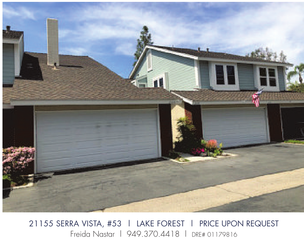 21155 SERRA VISTA, #53 | LAKE FOREST | PRICE UPON REQUEST Freida Nastar | 949.370.4418 | DRE# 01179816