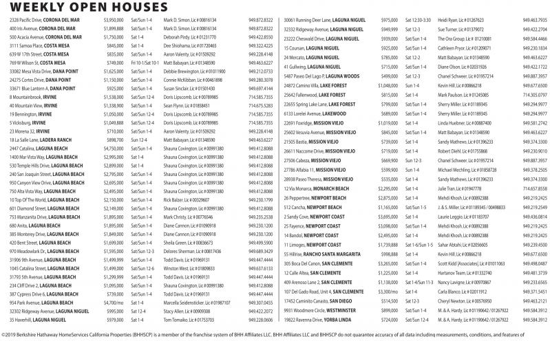 2328 Pacific Drive, CORONA DEL MAR $3,950,000 Sat/Sun 1-4 Mark D. Simon, Lic #00816134 949.872.8322 400IrisAvenue, CORONA DEL MAR $1,899,888 Sat/Sun 1-4 Mark D. Simon, Lic #00816134 949.872.8322 500Acacia Avenue, CORONADEL MAR $1,750,000 Sat 1-4 Deborah Pirdy, Lic #01231770 949.422.8550 3111 Samoa Place, COSTAMESA $845,000 Sat 1-4 Dee Shiohama, Lic #01720465 949.322.4225 639 W17th Street, COSTAMESA $835,000 Sat/Sun 1-4 Aaron Valenty, Lic #01509292 949.228.4148 769WWilson St, COSTAMESA $749,000 Fri 10-1/Sat 10-1 Matt Babayan, Lic #01348590 949.463.6227 33082 Mesa Vista Drive, DANA POINT $1,625,000 Sat/Sun 1-4 Debbie Brewington, Lic #01011900 949.212.0733 24275CortesDrive, DANA POINT $1,150,000 Sat/Sun 1-4 Connie McKibban, Lic #00461898 949.280.3078 33671 Blue Lantern A, DANA POINT $925,000 Sat/Sun 1-4 Susan Sinclair, Lic #01501430 949.697.4144 8Mountainbrook, IRVINE $1,538,000 Sat/Sun 12-4 Doris Lipscomb, Lic #00789985 714.585.7355 40 Mountain View, IRVINE $1,338,900 Sat/Sun 1-4 Sean Flynn, Lic #01858451 714.675.5283 19 Bennington, IRVINE $1,050,000 Sat/Sun 12-4 Doris Lipscomb, Lic #00789985 714.585.7355 5Vicksburg, IRVINE $1,049,888 Sat/Sun 12-4 Doris Lipscomb, Lic #00789985 714.585.7355 23 Morena 32, IRVINE $710,000 Sat/Sun 1-4 Aaron Valenty, Lic #01509292 949.228.4148 18 La Salle Lane, LADERARANCH $898,700 Sun 12-4 Matt Babayan, Lic #01348590 949.463.6227 2447 Catalina, LAGUNA BEACH $4,750,000 Sat/Sun 1-4 Shauna Covington, Lic #00991380 949.412.8088 1400 MarVista Way, LAGUNA BEACH $2,995,000 Sat 1-4 Shauna Covington, Lic #00991380 949.412.8088 530 Temple Hills Drive, LAGUNA BEACH $2,899,000 Sat 1-4 Shauna Covington, Lic #00991380 949.412.8088 240 San Joaquin Street, LAGUNA BEACH $2,795,000 Sat/Sun 1-4 Shauna Covington, Lic #00991380 949.412.8088 950 CanyonView Drive, LAGUNA BEACH $2,695,000 Sat/Sun 1-4 Shauna Covington, Lic #00991380 949.412.8088 750 Alta Vista Way, LAGUNA BEACH $2,495,000 Sat/Sun 1-4 Shauna Covington, Lic #00991380 949.412.8088 10 TopOfThe World, LAGUNA BEACH $2,150,000 Sat/Sun 1-4 Rick Balzer, Lic #00329607 949.230.1799 601 Diamond Street, LAGUNA BEACH $2,149,000 Sat/Sun 1-4 Shauna Covington, Lic #00991380 949.412.8088 753Manzanita Drive, LAGUNA BEACH $1,895,000 Sat/Sun 1-4 Mark Christy, Lic #00776546 949.235.2538 680 Anita, LAGUNA BEACH $1,895,000 Sat/Sun 1-4 Diane Cannon, Lic #01090918 949.230.1200 385Monterey Drive, LAGUNA BEACH $1,849,000 Sat/Sun 1-4 Diane Cannon, Lic #01090918 949.230.1200 420Bent Street, LAGUNA BEACH $1,699,000 Sat/Sun 1-4 Sheila Green, Lic #00836673 949.499.5900 970Meadowlark Dr., LAGUNA BEACH $1,595,000 Sat/Sun12-3 Delores Sherman, Lic #00817436 949.689.3429 319069th Avenue, LAGUNA BEACH $1,499,999 Sat/Sun 1-4 Todd Davis, Lic #01969131 949.447.4444 1045 Catalina Street, LAGUNA BEACH $1,499,000 Sat/Sun 12-6 Winston West, Lic #01809833 949.637.6133 317935th Avenue, LAGUNA BEACH $1,299,999 Sat/Sun 1-4 Todd Davis, Lic #01969131 949.447.4444 234Cliff Drive2,LAGUNA BEACH $1,095,000 Sat/Sun 1-4 Shauna Covington, Lic #00991380 949.412.8088 387 CypressDrive6,LAGUNA BEACH $739,000 Sat/Sun 1-4 Todd Davis, Lic #01969131 949.447.4444 954ParkAvenue, LAGUNA BEACH $4,700/mo Sat 1-4 Marcella Seidensticker, Lic #01987107 949.307.0455 32302RidgewayAvenue, LAGUNA NIGUEL $995,000 Sat 12-4 StacyAllen, Lic #00909308 949.422.2072 35 Haverhill, LAGUNA NIGUEL $979,000 Sat 1-4 TomTomaiko, Lic #01753703 949.228.0606