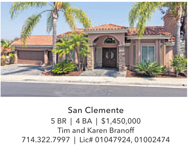 San Clemente 5 BR | 4 BA | $1,450,000 Tim and Karen Branoff 714.322.7997 | Lic# 01047924, 01002474