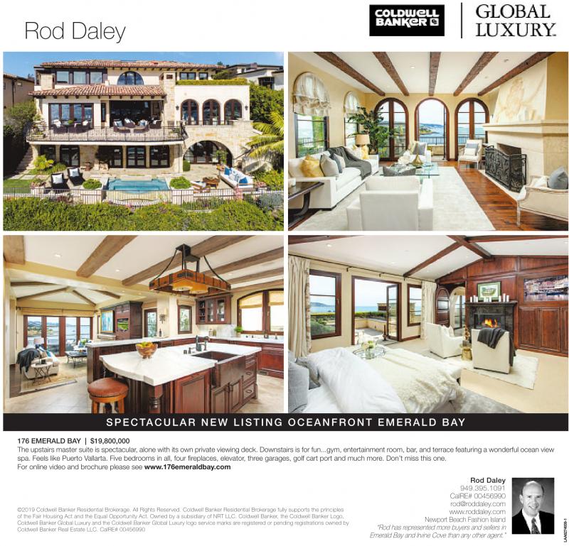 Rod Daley SPECTACULAR NEW LISTING OCEANFRONT EMERALD BAY 176 EMERALD BAY | $19,800,000 The upstairs master suite is spectacular, alone with its own private viewing deck. Downstairs is for fun...gym, entertainment room, bar, and terrace featuring a wonderful ocean view spa. Feels like Puerto Vallarta. Five bedrooms in all, four fireplaces, elevator, three garages, golf cart port and much more. Don’t miss this one. For online video and brochure please see www.176emeraldbay.com ©2019 Coldwell Banker Residential Brokerage. All Rights Reserved. Coldwell Banker Residential Brokerage fully supports the principles of the Fair Housing Act and the Equal Opportunity Act. Owned by a subsidiary of NRT LLC. Coldwell Banker, the Coldwell Banker Logo, Coldwell Banker Global Luxury and the Coldwell Banker Global Luxury logo service marks are registered or pending registrations owned by Coldwell Banker Real Estate LLC. CalRE# 00456990 Rod Daley 949.395.1091 CalRE# 00456990 rod@roddaley.com www.roddaley.com Newport Beach Fashion Island “Rod has represented more buyers and sellers in Emerald Bay and Irvine Cove than any other agent.”