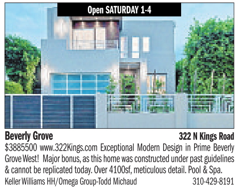 Beverly Grove 322NKings Road $3885500 www.322Kings.com Exceptional Modern Design in Prime Beverly GroveWest! Major bonus,asthis home was constructed under past guidelines &cannot be replicated today.Over 4100sf, meticulous detail. Pool &Spa. Keller Williams HH/Omega Group-Todd Michaud 310-429-8191
