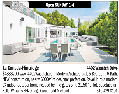 La Canada-Flintridge 4402 Wasatch Drive $4888700 www.4402Wasatch.com Modern Architectural, 5Bedroom,6Bath, NEW construction, nearly 6000sfofdesigner perfection.Revel in this modern CA indoor-outdoor home nestled behindgates on a21,507 sf lot.Spectacular! KellerWilliams HH/Omega Group-Todd Michaud 310-429-8191