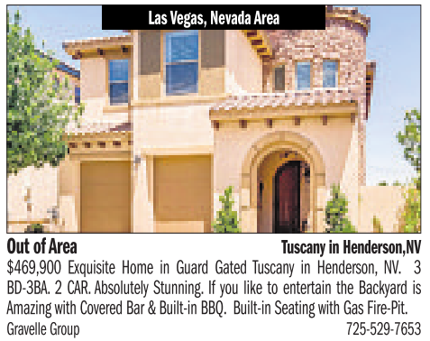 Out of Area Tuscany in Henderson,NV $469,900 Exquisite Home in Guard Gated Tuscany in Henderson, NV. 3 BD-3BA. 2CAR. Absolutely Stunning.Ifyou like to entertain the Backyard is Amazing with Covered Bar &Built-in BBQ. Built-in Seatingwith Gas Fire-Pit. Gravelle Group 725-529-7653