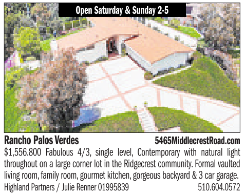 Rancho Palos Verdes 5465MiddlecrestRoad.com $1,556.800 Fabulous 4/3, single level, Contemporary with natural light throughout on alarge corner lot in the Ridgecrest community.Formal vaulted living room, family room, gourmetkitchen, gorgeous backyard &3car garage. Highland Partners /Julie Renner01995839 510.604.0572