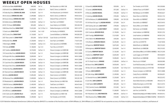 24736 ViaSan Rafael, ALISO VIEJO $469,900 Sat 1-4 Bob Strausheim, Lic #00611168 949.874.0300 2328 Pacific Drive, CORONA DELMAR $3,950,000 Sat/Sun 1-4 Mark D. Simon, Lic #00816134 949.872.8322 34 Drakes BayDrive, CORONADEL MAR $2,798,000 Sun 1-4 Amir Abouhossein, Lic#01961651 949.338.0707 400 Iris Avenue, CORONA DEL MAR $1,899,888 Sat/Sun 1-4 Mark D. Simon, Lic #00816134 949.872.8322 500 Acacia Avenue, CORONA DELMAR $1,649,000 Sat 1-4 Deborah Pirdy, Lic #01231770 949.422.8550 924Dahlia Avenue, COSTAMESA $1,089,900 Sat/Sun 1-4 Sean Flynn, Lic #01858451 714.675.5283 639W17th Street, COSTAMESA $835,000 Sat/Sun 1-4 Aaron Valenty, Lic #01509292 949.228.4148 33082 Mesa Vista Drive, DANA POINT $1,625,000 Sat 12-3/Sun 1-4 Debbie Brewington, Lic #01011900 949.212.0733 15 Santa Lucia, DANA POINT $1,549,900 Sun 1-4:30 Jim Shockey, Lic#00380355 949.300.0900 24275 Cortes Drive, DANA POINT $1,150,000 Sun 1-4 Connie McKibban, Lic#00461898 949.280.3078 33671 Blue Lantern A, DANA POINT $925,000 Sat/Sun 1:30-4:30 Susan Sinclair, Lic #01501430 949.697.4144 40 Mountain View, IRVINE $1,338,900 Sat/Sun 1-4 Sean Flynn, Lic #01858451 714.675.5283 19 Bennington, IRVINE $1,050,000 Sat/Sun 12-4 Doris Lipscomb, Lic #00789985 714.585.7355 7543 Avila, LA VERNE $1,188,000 Sun 12-4 Traci Cline, Lic #01334711 714.592.5483 2447 Catalina, LAGUNA BEACH $4,750,000 Sat/Sun 1-4 Shauna Covington, Lic #00991380 949.412.8088 134Crescent BayDrive, LAGUNA BEACH $3,395,000 Sun 1-4 Shauna Covington, Lic #00991380 949.412.8088 530Temple Hills Drive, LAGUNA BEACH $2,899,000 Sat 1-4 Shauna Covington, Lic #00991380 949.412.8088 240 San Joaquin Street, LAGUNA BEACH $2,795,000 Sat/Sun 1-4 Shauna Covington, Lic #00991380 949.412.8088 757Coast View Drive, LAGUNA BEACH $2,749,000 Sat/Sun 1-4 Shauna Covington, Lic #00991380 949.412.8088 950 CanyonView Drive, LAGUNA BEACH $2,695,000 Sat/Sun 1-4 Shauna Covington, Lic #00991380 949.412.8088 750 Alta Vista Way, LAGUNA BEACH $2,495,000 Sat/Sun 1-4 Shauna Covington, Lic #00991380 949.412.8088 601 Diamond Street, LAGUNA BEACH $2,149,000 Sat/Sun 1-4 Shauna Covington, Lic #00991380 949.412.8088 680Anita, LAGUNA BEACH $1,895,000 Sat/Sun 1-4 Diane Cannon, Lic #01090918 949.230.1200 385Monterey Drive, LAGUNA BEACH $1,849,000 Sat/Sun 1-4 Diane Cannon, Lic #01090918 949.230.1200 970Meadowlark Dr., LAGUNA BEACH $1,595,000 Sun 1-4 Delores Sherman, Lic #00817436 949.689.3429 319069th Avenue, LAGUNA BEACH $1,499,999 Sat/Sun 2-5 Todd Davis, Lic #01969131 949.447.4444 1045 Catalina Street, LAGUNA BEACH $1,499,000 Sat/Sun 1-5 Winston West, Lic #01809833 949.637.6133 234 Cliff Drive2,LAGUNA BEACH $1,095,000 Sat/Sun 1-4 Shauna Covington, Lic #00991380 949.412.8088 6Ash Creek Lane 89, LAGUNA HILLS $546,700 Sun 1-4 Bob Strausheim, Lic #00611168 949.874.0300 30791SeminolePlace, LAGUNA NIGUEL $1,499,000 Sun 1-4 TomTomaiko, Lic #01753703 949.228.0606
