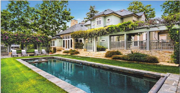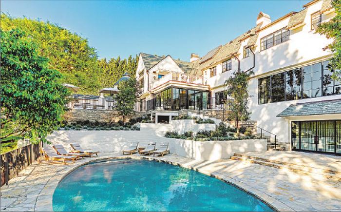 Built in 1933 and recently renovated, the stately two-story has more than 10,000 square feet of living space, custom steel-framed windows and two kitchens. Other features include multiple wet bars, ascreening room and a gym. A total of five bedrooms and 12 bathrooms, which includes a guesthouse, rounds out the living space.