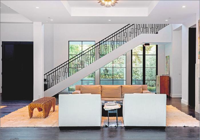 Shades of black and white color the living spaces, which include a two-story foyer with dual staircases, an indoor-outdoor living room and a sleek, whitewashed  kitchen. Farther in, there’s a stylish family room with a wet bar and wine cellar.