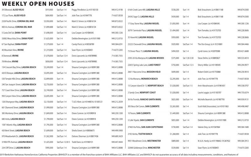 172Las Flores, ALISO VIEJO $604,900 Sat/Sun 1-4 Julie Tran, Lic #01947778 714.657.8558 2328 Pacific Drive, CORONA DEL MAR $3,950,000 Sat/Sun 1-4 Mark D. Simon, Lic #00816134 949.872.8322 400 Iris Avenue, CORONA DEL MAR $1,899,888 Sat/Sun 1-4 Mark D. Simon, Lic #00816134 949.872.8322 5Costa Del Sol, DANA POINT $1,698,000 Sat/Sun 1-4 Lisa Cooper, Lic #01084345 949.300.1236 33082 Mesa Vista Drive, DANA POINT $1,625,000 Sat 1-4 Debbie Brewington, Lic #01011900 949.212.0733 67 San Raphael, DANA POINT $1,579,000 Sun 1-4 Candy Flock, Lic #00558789 949.584.6291 40 Mountain View, IRVINE $1,319,000 Sat/Sun 1-4 Sean Flynn, Lic #01858451 714.675.5283 8Stonewall, IRVINE $1,078,000 Sat/Sun 12-4 Doris Lipscomb, Lic #00789985 714.585.7355 78 Winslow, IRVINE $858,000 Sat/Sun 12-4 Doris Lipscomb, Lic #00789985 714.585.7355 134Crescent BayDrive, LAGUNA BEACH $3,249,000 Sun 1-4 Shauna Covington, Lic #00991380 949.412.8088 420 El Bosque, LAGUNA BEACH $3,095,000 Sat/Sun 1-4 Shauna Covington, Lic #00991380 949.412.8088 530Temple Hills Drive, LAGUNA BEACH $2,899,000 Sun 1-4 Shauna Covington, Lic #00991380 949.412.8088 240San Joaquin Street, LAGUNA BEACH $2,750,000 Sat/Sun 1-4 Shauna Covington, Lic #00991380 949.412.8088 757 CoastView Drive, LAGUNA BEACH $2,749,000 Sat/Sun 1-4 Shauna Covington, Lic #00991380 949.412.8088 950CanyonView Drive, LAGUNA BEACH $2,695,000 Sun 1-4 Shauna Covington, Lic #00991380 949.412.8088 1265 Brangwyn Way, LAGUNA BEACH $2,150,000 Sat/Sun 1-4 T. &D.Klein, Lic#01448516 /01305121 949.212.2039 601 Diamond Street, LAGUNA BEACH $1,999,000 Sat/Sun 1-4 Shauna Covington, Lic #00991380 949.412.8088 385Monterey Drive, LAGUNA BEACH $1,849,000 Sat/Sun 1-4 Diane Cannon, Lic#01090918 949.230.1200 680 Anita, LAGUNA BEACH $1,799,000 Sat/Sun 1-4 Diane Cannon, Lic#01090918 949.230.1200 1587 Atlantic Way, LAGUNA BEACH $1,795,000 Sat/Sun 1-4 Shauna Covington, Lic #00991380 949.412.8088 420 Bent Street, LAGUNA BEACH $1,699,000 Sat/Sun 1-4 Sheila Green, Lic #00836673 949.499.5900 970Meadowlark Dr., LAGUNA BEACH $1,562,900 Sat/Sun 1-4 Delores Sherman, Lic #00817436 949.689.3429 31906 9ThAvenue, LAGUNA BEACH $1,425,000 Sat/Sun 12:30-5 Todd Davis, Lic #01969131 949.447.4444 234 Cliff Drive2,LAGUNA BEACH $995,000 Sat/Sun 1-4 Shauna Covington, Lic #00991380 949.412.8088