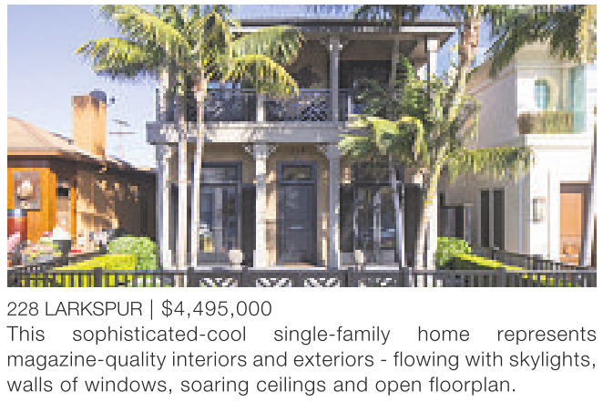 228 LARKSPUR | $4,495,000 This sophisticated-cool single-family home represents magazine-quality interiors and exteriors - flowing with skylights, walls of windows, soaring ceilings and open floorplan.