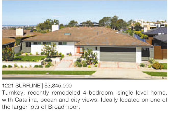 1221 SURFLINE | $3,845,000 Turnkey, recently remodeled 4-bedroom, single level home, with Catalina, ocean and city views. Ideally located on one of the larger lots of Broadmoor.