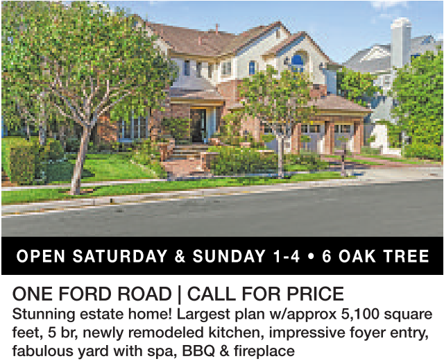 ONE FORD ROAD | CALL FOR PRICE Stunning estate home! Largest plan w/approx 5,100 square feet, 5 br, newly remodeled kitchen, impressive foyer entry, fabulous yard with spa, BBQ & fireplace