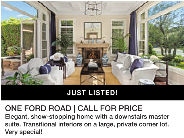 ONE FORD ROAD | CALL FOR PRICE Elegant, show-stopping home with a downstairs master suite. Transitional interiors on a large, private corner lot. Very special!