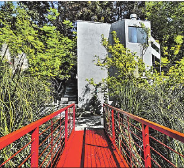 Outside, concrete steps and a bridge are used to navigate a collection of patios, deck spaces and terraces.