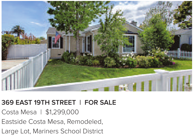 369 EAST 19TH STREET | FOR SALE Costa Mesa | $1,299,000 Eastside Costa Mesa, Remodeled, Large Lot, Mariners School District