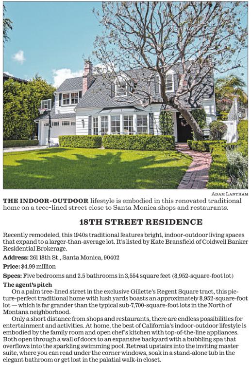Adam Lantham THE INDOOR-OUTDOOR lifestyle is embodied in this renovated traditional home on a tree-lined street close to Santa Monica shops and restaurants. 18TH STREET RESIDENCE Recently remodeled, this 1940s traditional features bright, indoor-outdoor living spaces that expand to a larger-than-average lot. It’s listed by Kate Bransfield of Coldwell Banker Residential Brokerage. Address: 26118th St., Santa Monica, 90402 Price: $4.99 million Specs: Five bedrooms and 2.5 bathrooms in 3,554 square feet (8,952-square-foot lot) The agent’s pitch On a palm tree-lined street in the exclusive Gillette’s Regent Square tract, this picture-perfect traditional home with lush yards boasts an approximately 8,952-square-foot lot — which is far grander than the typical sub-7,700-square-foot lots in the North of Montana neighborhood. Only a short distance from shops and restaurants, there are endless possibilities for entertainment and activities. At home, the best of California’s indoor-outdoor lifestyle is embodied by the family room and open chef’s kitchen with top-of-the-line appliances. Both open through a wall of doors to an expansive backyard with a bubbling spa that overflows into the sparkling swimming pool. Retreat upstairs into the inviting master suite, where you can read under the corner windows, soak in a stand-alone tub in the elegant bathroom or get lost in the palatial walk-in closet.