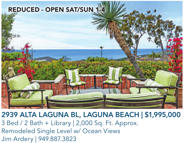 2939 ALTA LAGUNA BL, LAGUNA BEACH | $1,995,000 3 Bed / 2 Bath + Library | 2,000 Sq. Ft. Approx. Remodeled Single Level w/ Ocean Views Jim Ardery | 949.887.3823