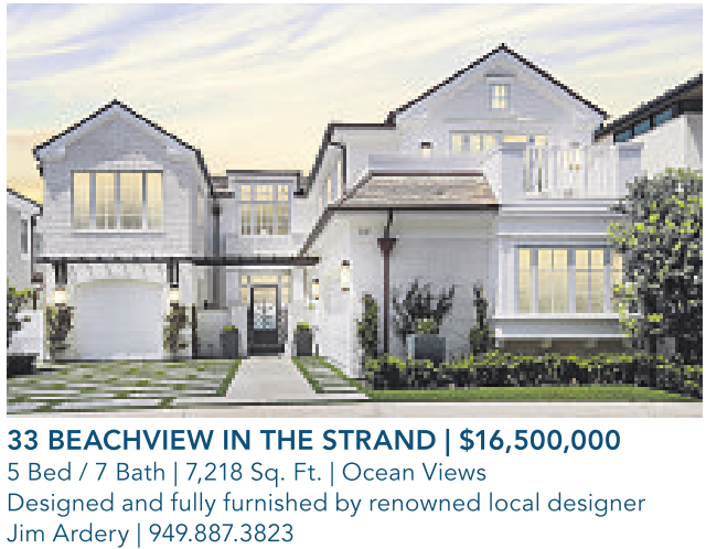 33 BEACHVIEW IN THE STRAND | $16,500,000 5 Bed / 7 Bath | 7,218 Sq. Ft. | Ocean Views Designed and fully furnished by renowned local designer Jim Ardery | 949.887.3823