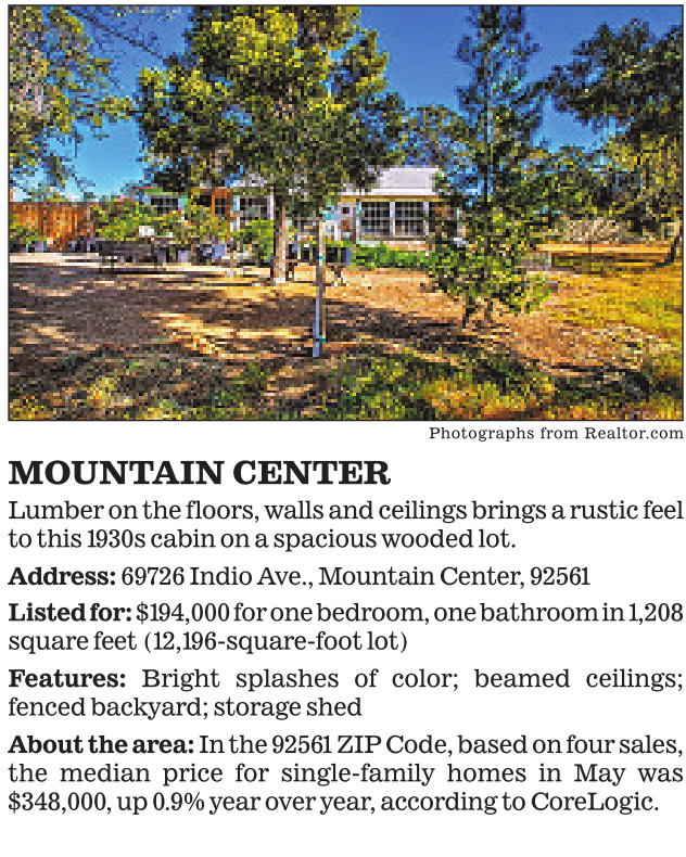 Photographs from Realtor.com MOUNTAIN CENTER Lumber on the floors, walls and ceilings brings a rustic feel to this 1930s cabin on a spacious wooded lot. Address: 69726 Indio Ave., Mountain Center, 92561 Listed for: $194,000 for one bedroom, one bathroom in1,208 square feet (12,196-square-foot lot) Features: Bright splashes of color; beamed ceilings; fenced backyard; storage shed About the area: In the 92561 ZIP Code, based on four sales, the median price for single-family homes in May was $348,000, up 0.9% year over year, according to CoreLogic.