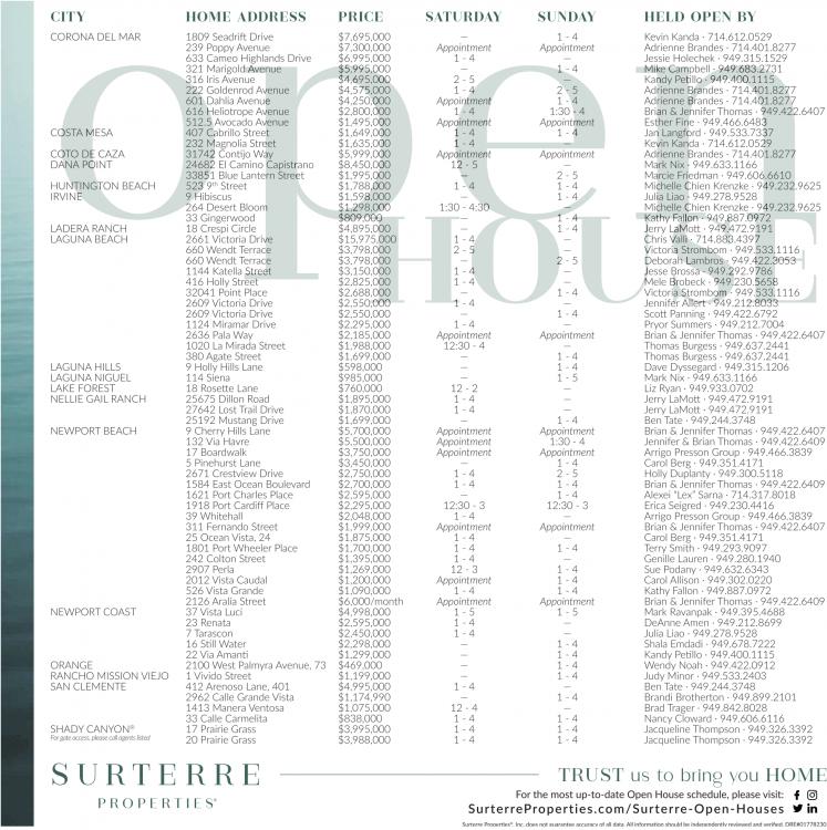 CITY HOME ADDRESS PRICE SATURDAY SUNDAY HELD OPEN BY CORONA DEL MAR Appointment Appointment Appointment Appointment Appointment MESA Appointment Appointment DANA LADERA Appointment Appointment Appointment Appointment Appointment Appointment Appointment Appointment Appointment Appointment Appointment Appointment ® Forgateaccess,please call agents listed SurterreProperties.com/Surterre-Open-Houses ®