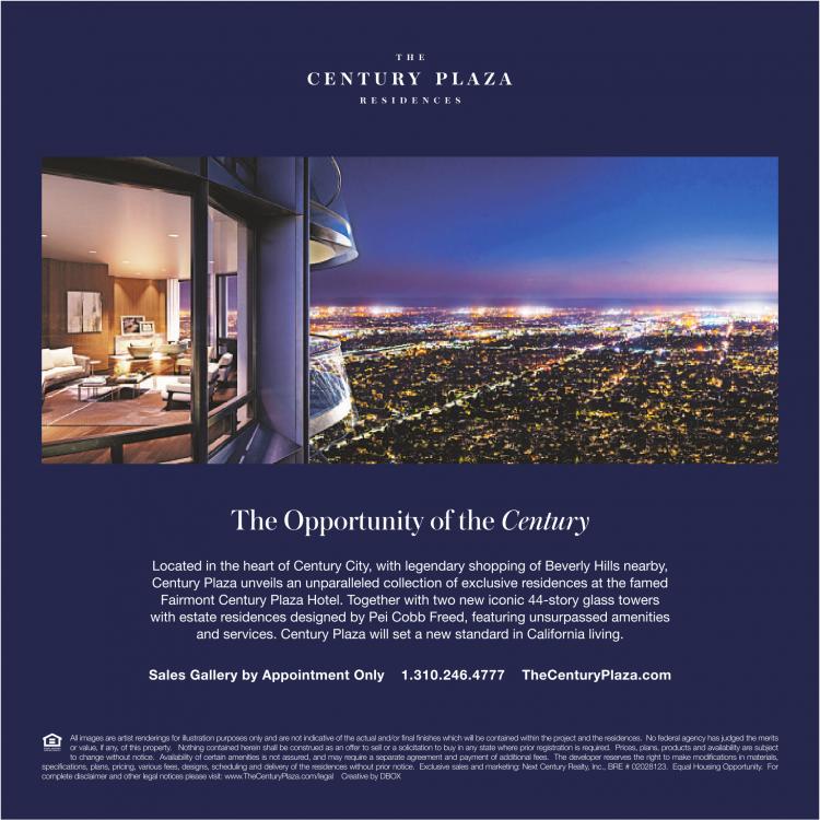 All images areartist renderings for illustration purposes only and arenot indicative of the actual and/or final finishes which will be contained within the project and the residences. No federal agency has judged the merits or value, if any, ofthis property. Nothing contained herein shall be construed as an offer to sell or asolicitation to buy in any state where prior registration is required. Prices, plans, products and availability are subject to change without notice. Availability of certain amenities is not assured, and may require a separate agreement and payment of additional fees. The developer reserves the right to make modifications in materials, specifications, plans, pricing, various fees, designs, scheduling and delivery of the residences without prior notice. Exclusive sales and marketing: Next Century Realty, Inc., BRE #02028123. Equal Housing Opportunity. For complete disclaimer and other legal notices please visit: www.TheCenturyPlaza.com/legal Creative by DBOX