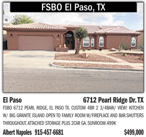 FSBO El Paso, TX El Paso 6712 Pearl RidgeDr.TX FSBO 6712 PEARL RIDGE, EL PASO TX. CUSTOM 4BR 23/4BAW/ VIEW! KITCHEN W/ BIGGRANITE ISLAND OPENTOFAMILYROOM W/FIREPLACE AND BAR.SHUTTERS THROUGHOUT.ATTACHED STORAGE PLUS2CARGA. SUNROOM.499K AlbertNapoles 915-457-6681 $499,000